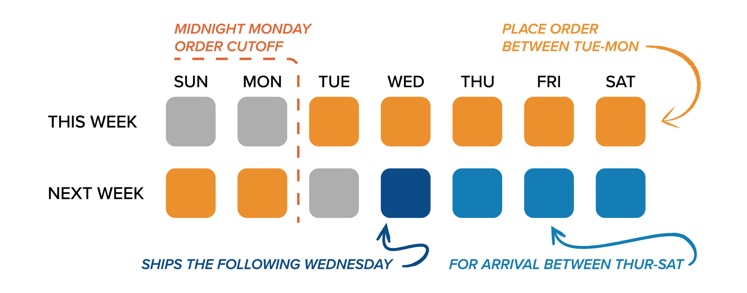 Please note that we will be taking orders past these deadlines, but we recommend placing orders to ship the week before your desired holiday delivery date in order to ensure on-time arrival.